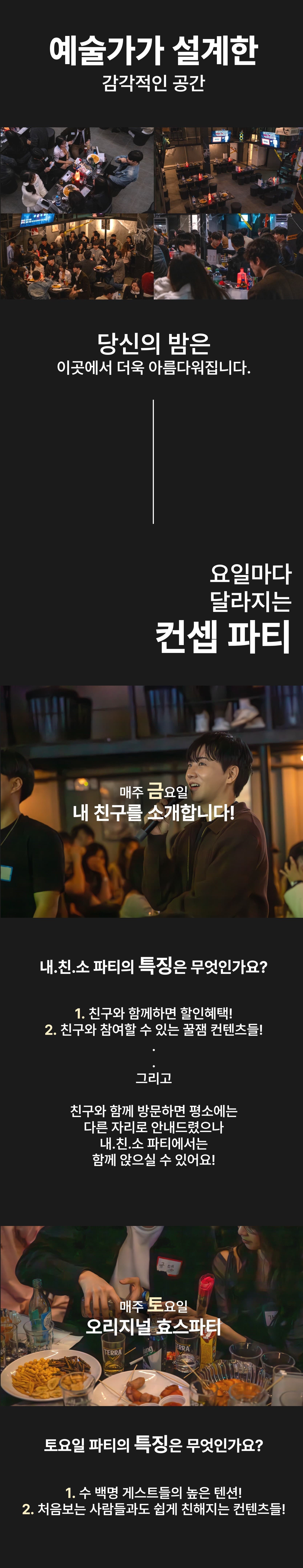 서울에서 가장 트렌디한 장소에서, 당신만의 이야기를 시작하세요. 250명이라는 최적 규모가 만들어내는 에너지와 다양성, 그리고 핫한 분위기 속에서 만나는 사람들의 미소와 대화. 이 모든 것이 신촌점만의 고유한 매력입니다.